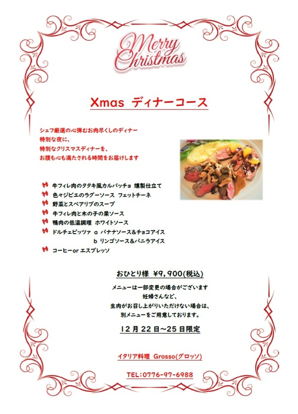 ※12月22日~25日のディナータイムは下記コース料理のみとなります。ご了承くださいませ。